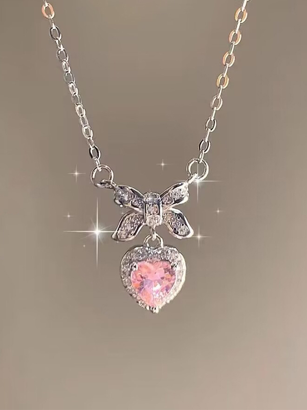 Collar con colgante de corazón rosa con lazo brillante y dulce