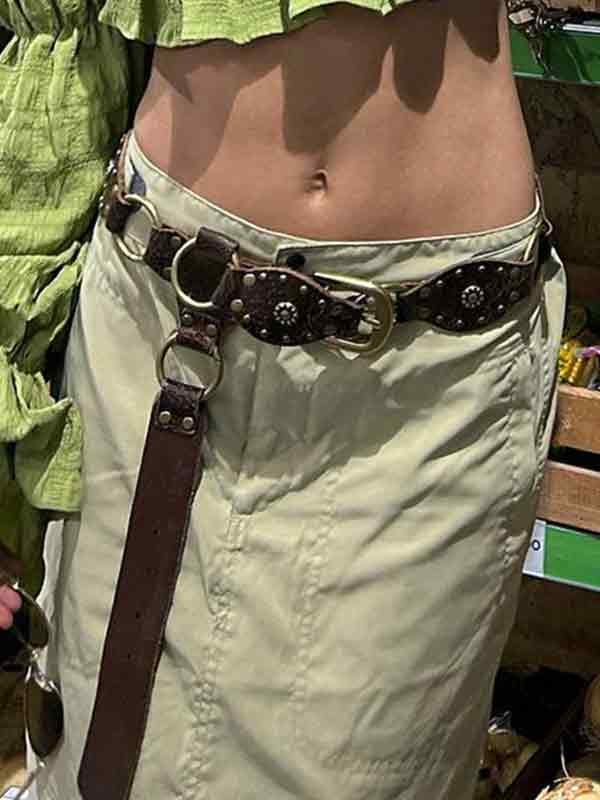 Cinturón de hebilla de patchwork de cuero con anillo recortado de remache vintage
