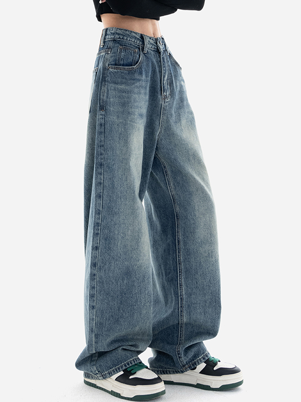 Vaqueros holgados de mezclilla lavada con estampado de encaje 3D falso y costuras laterales