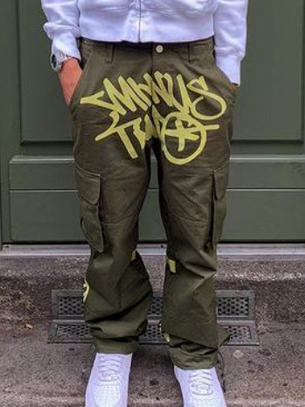 Pantalones anchos con cordón y múltiples bolsillos con estampado de letras para hombre