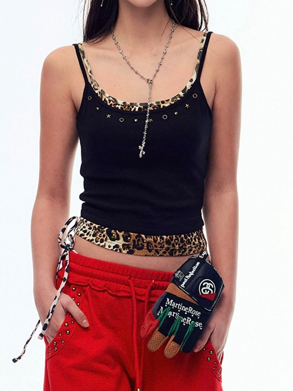 Top tipo camisola con busto de patchwork y estampado de leopardo y encaje