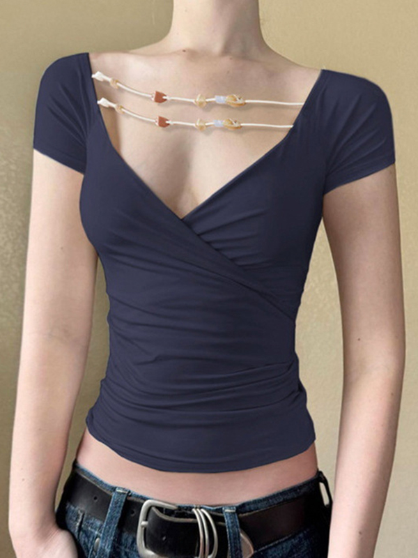 Camiseta de manga corta con cuello en V y color liso