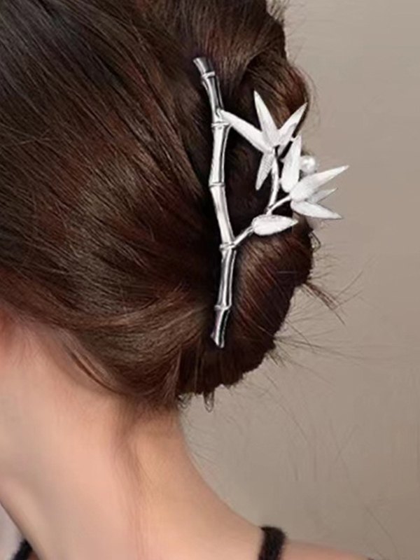 Pinza de pelo plateada con hoja de bambú