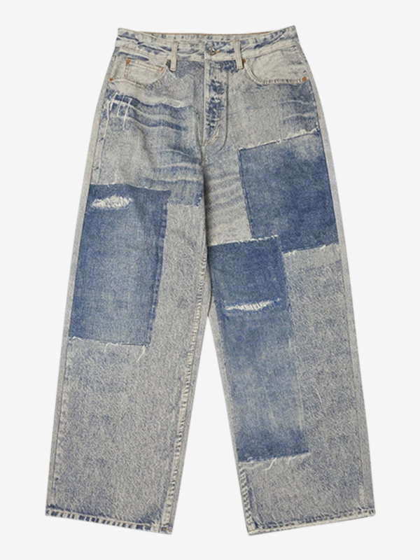 Vaqueros con estampado de patchwork desgastado retro