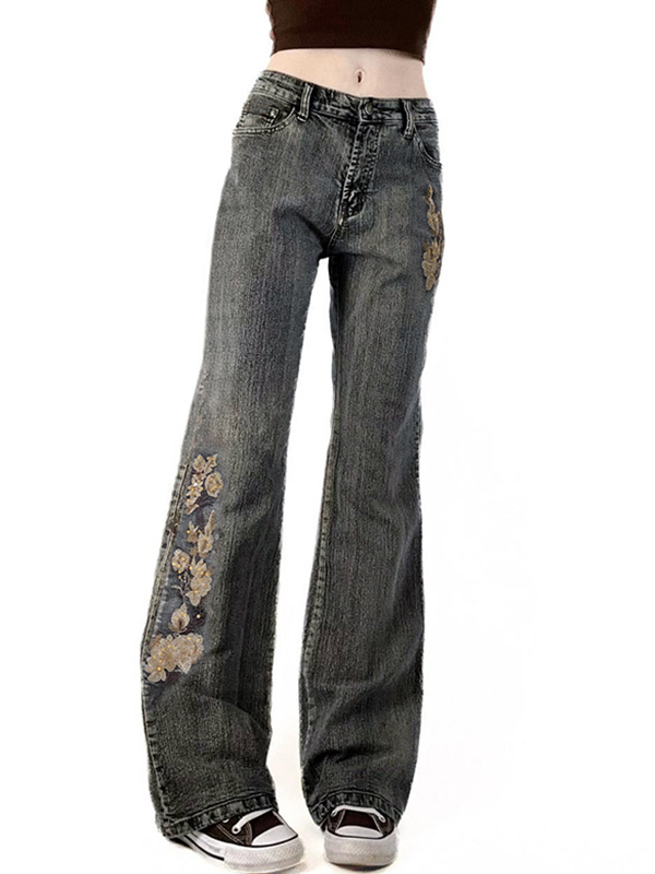 Diseños de flores bordadas con cuentas y pantalones vaqueros acampanados