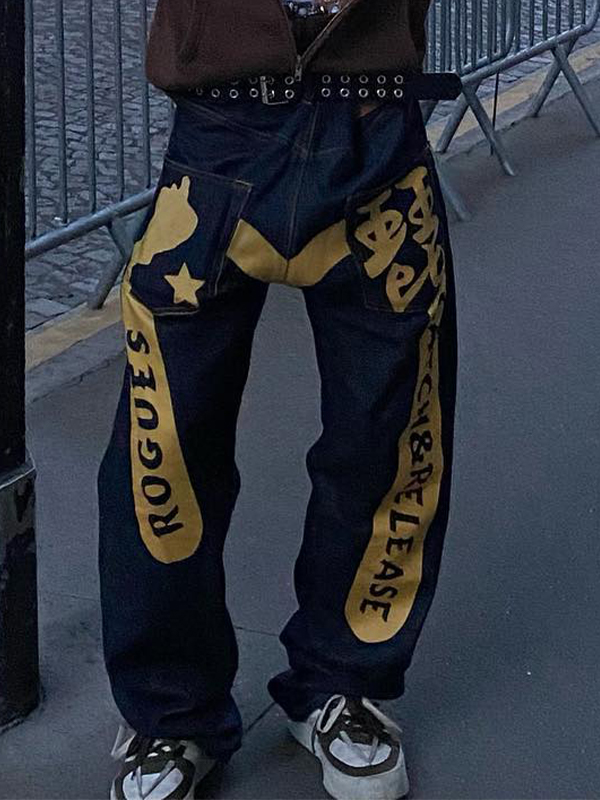 Pantalones vaqueros holgados con estampado de letras y calaveras para hombre