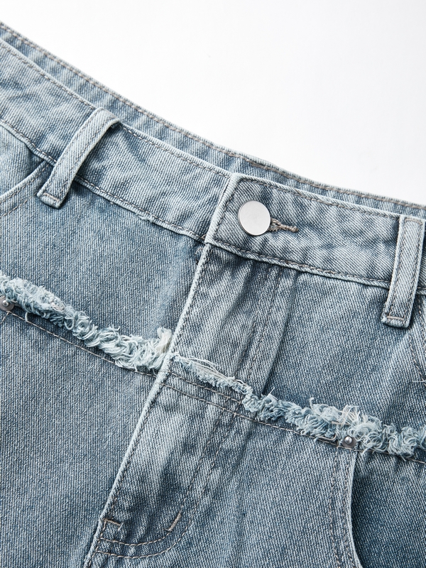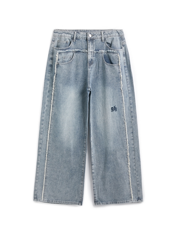 Descripción: Estos jeans holgados de mezclilla con lavado descolorido para hombre tienen una silueta de pierna de patinador, tienen una pierna de parches con diseño de ribetes de corte sin rematar, presentan un logotipo bordado y detalles de bolsillos de jeans funcionales.