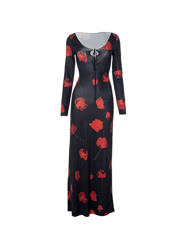 Vestidos largos con escote en V, lazo y estampado abstracto en contraste